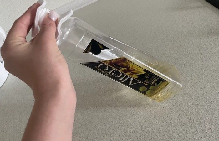 И поможет нам в этом обычное растительное масло. Просто смочите им ватный диск и протрите липкий слой. Он отмоется в считанные секунды, и больше вас не расстроит ни одна этикетка.