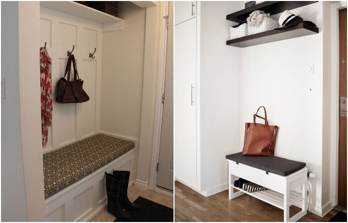 Установили в прихожей шкаф, комод, обувницу, но забыли про место, куда можно будет присесть? Нужно срочно исправлять ситуацию, иначе вам будет неудобно обуваться и разуваться. Присмотритесь к небольшому пуфу, банкетке или скамейке – это базовые варианты. Под ними может быть полка для обуви или ниша для хранения вещей. Если в комнате совсем мало места, тогда отдавайте предпочтение компактным встроенным или откидным сиденьям, которые займут минимум места. Кстати, сюда же можно будет поставить сумку или пакеты с продуктами по приходу домой – очень удобно.