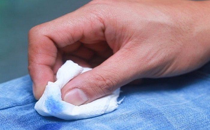 • Следы от чернил можно вывести любым спиртосодержащим средством, например, лаком для волос или дезинфектором для рук. Перед началом процедуры проверьте, не повлияет ли жидкость на цвет изделия – нанесите небольшое количество на незаметный участок, а затем промокните салфеткой. Если она осталась чистой, можете действовать. Обработайте пятно лаком, промойте под струей холодной воды и отправьте в стирку.