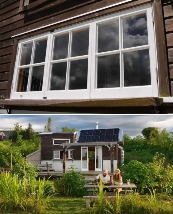 Именно устойчивость и ведение органического хозяйства являлись ключевой идеей строительства собственного дома вдали от городской суеты. Это и стало причиной того, что посадка деревьев на участке и его разработка велись параллельно с его строительством. А также приверженность ко всему натуральному заставила отказаться от использования утеплителей неорганического происхождения, как и других отделочных материалов. При этом пара не поскупилась на щедрое остекление, хотя окна оказались разного размера и конфигурации, поскольку они использовались вторично. Мало того, что окна и двери пропускают достаточное количество естественного света, позволяющего экономить на электричестве в дневное время суток, так еще дают возможность наслаждаться живописным ландшафтом, окружающим домик. Не забыли и об естественной циркуляцией воздуха, организация которой стала ключевым элементам дизайна. В небольшом доме предусмотрено множество открывающихся окон, включая двустворчатое, которое органично соединяет внутреннее пространство с природным окружением.