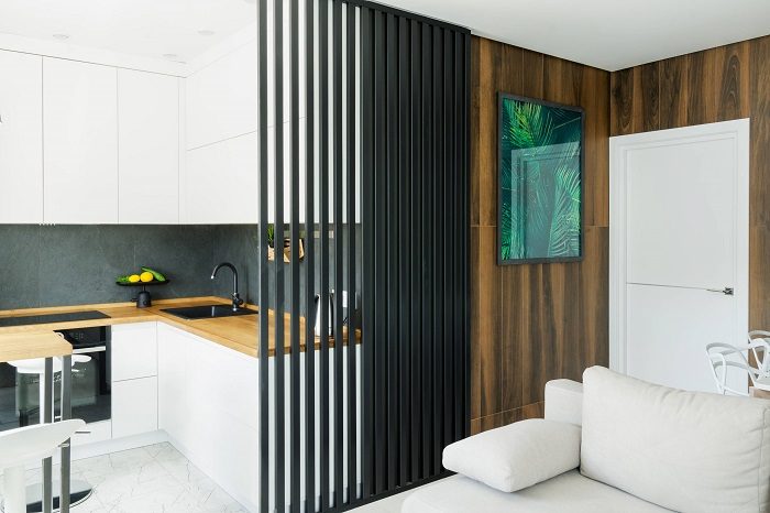 Деревянные рейки можно использовать для зонирования.