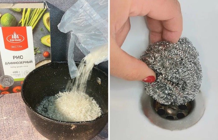 Чтобы избавиться от нагара в сотейнике, вам понадобится обычный рис. Просто засыпьте пригоревшее дно тонким слоем сухого риса. После чего залей водой и поставьте на огонь. Сварите рис, как обычно, и дайте ему остыть. А доставая его из сотейника, вы обнаружите, что нагар достается вместе с крупой. А сам сотейник остается чистым. Вот такой необычный, но рабочий совет.