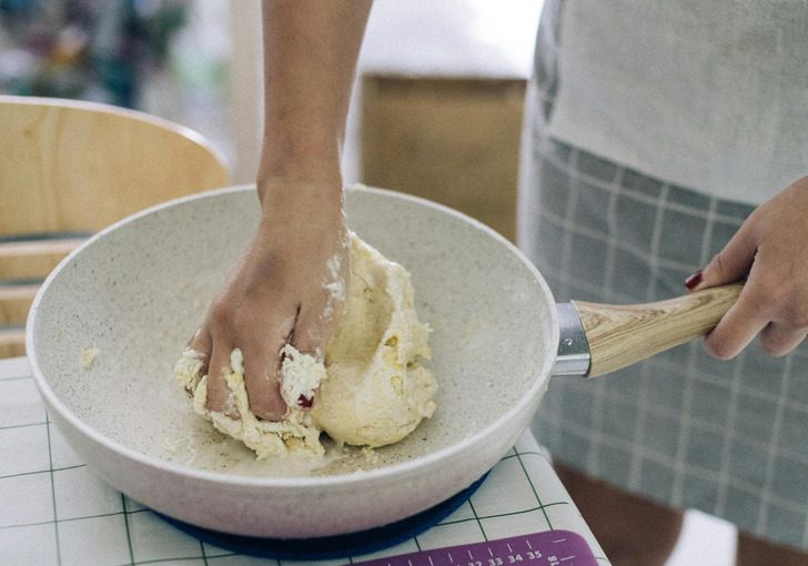 7. Если при работе с тестом в обычной посуде оно сильно прилипает к стенкам, попробуйте замешивать его в сковороде с антипригарным покрытием