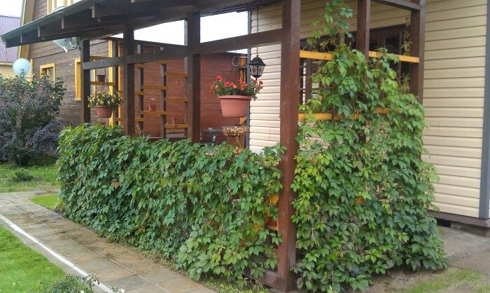 Девичий виноград — пожалуй, самое популярное растение для вертикального озеленения, которые присутствует у многих садоводов. Оно при хорошем росте может достигать до двадцати сантиметров в длину и очень живучее. Его побеги разрастаются быстро, а листва при этом густая, к тому же меняющая свою окраску в зависимости от сезона: весной и летом зелёная, а к осени становится алой. Побеги винограда могут образовывать собой плотную ширму, потому он отлично подходит для маскировки под собой как самих построек на участке, так и его малоприглядных зон. Оно отлично растёт в тени, не требует особого ухода и морозостойкое.