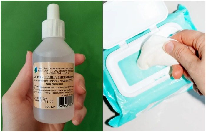• Хлоргексидин. Если высохли антибактериальные салфетки, следует использовать не простую воду, а какой-нибудь антисептик, например, хлоргекседин. Добавьте в упаковку несколько капель и подождите, пока салфетки вновь станут влажными.