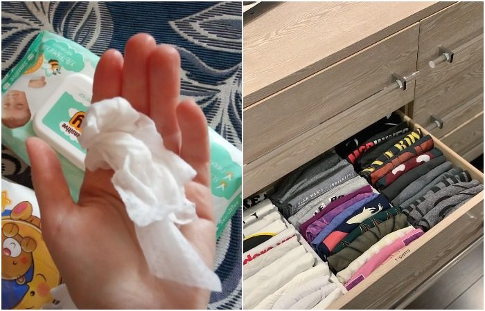 Если вы почувствовали, что из шкафа доносится неприятный запах, а никакого саше для ароматизации под рукой не оказалось, попробуйте использовать вместо него обычные влажные салфетки. В чем состоит эффективность этого лайфхака? Салфетки проспиртованы и обладают приятным ароматом, благодаря чего они могут на дольше сохранить свежесть постиранных вещей.