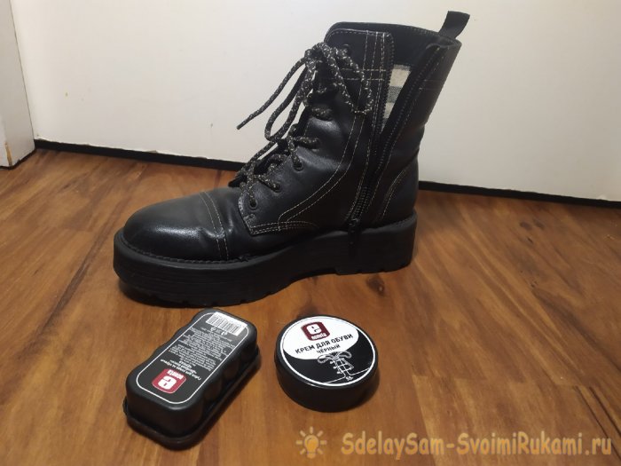 Кожа и кожзам. Натрите обувь кремом. Кожа на обуви из кожзаменителя, конечно, грубее, чем на натуральной, но, принцип тот же. Она трескается и сохнет без крема. Оставьте крем впитываться.