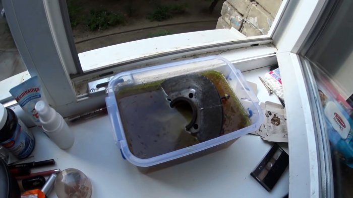 В такой ванночке за 2-3 минуты можно реставрировать резьбу на заржавевших болтах и гайках. Раствор по мере использования слабеет, и постепенно теряет очищающую способность.