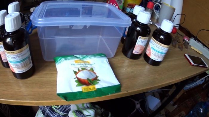 В емкость наливается перекись водорода в таком объеме, чтобы полностью погрузить в нее ржавую деталь. После этого добавляется лимонная кислота. Чем ее больше, тем быстрее будет растворена ржавчина. В примере в 1,2 л перекиси высыпано 100 гр. кислоты.
