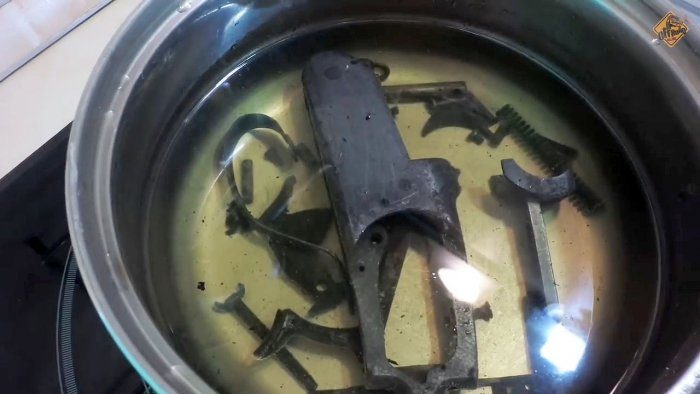 В кипятке кислота растворяется даже без помешивания. Раствор с ржавыми деталями оставляется на огне на 5 минут.