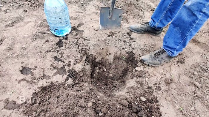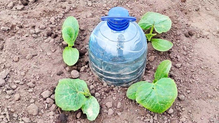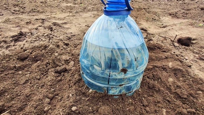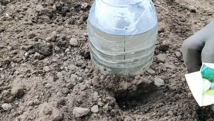 На грядке вырывается лунка, и в нее прикапываете бутыль, заполненный водой. Его следует углубить на 10-15 см. Крышка бутыли обязательно должна быть закрытой. Без нее вода будет утекать очень быстро.
