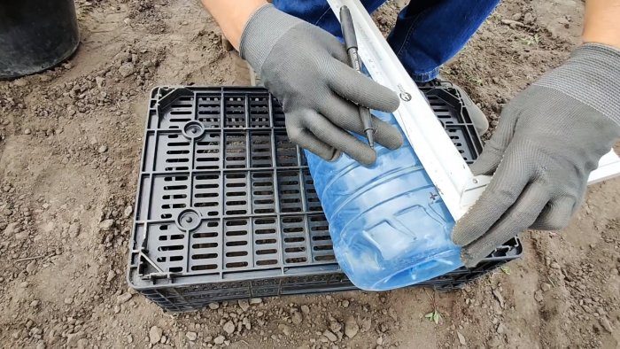 Бутыль нужно разделить на 4 части продольными метками, и просверлить по ним отверстия сверлом 1 мм у дна на первой ребре жесткости. Еще проще пробить их горячим шилом. Метки ставятся в виде линий, чтобы потом видеть где располагаются отверстия, так как те будут в грунте.