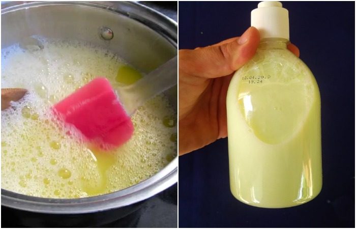 Утром добавьте 1200 миллилитров воды, несколько капель эфирного масла и две чайных ложки глицерина, и еще раз «заварите» массу. Важно, чтобы в результате она приобрела консистенцию классического жидкого мыла. Когда смесь остынет, перелейте ее во флакон с дозатором и пользуйтесь по назначению.