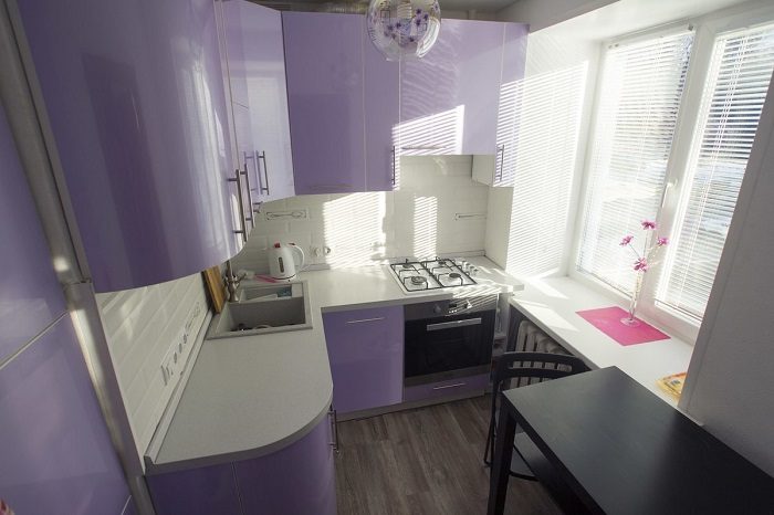 Для этого необходимо правильно распорядиться имеющимися квадратными метрами. Лучше всего выбирать кухонный гарнитур до потолка, устанавливать складной стол и стулья, которые после трапезы можно будет сложить, чтобы не мешали, задействовать подоконник и свободные углы для хранения. Также выбирайте встроенную технику – она позволяет существенно сэкономить место.