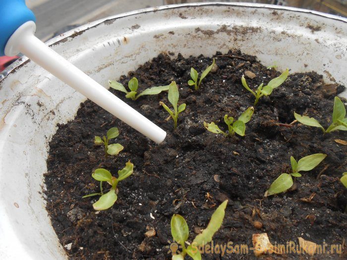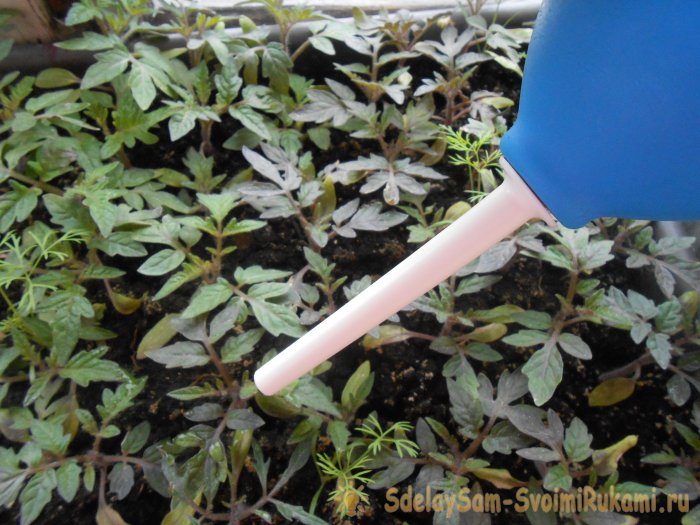 Внесение удобрения жидкого удобнее всего проводить из спринцовки или большого шприца, особенно если ваши кустики обитают в общих посадочных емкостях. Под каждый помидорный сеянец выливается приблизительно 5 мл приготовленного раствора.