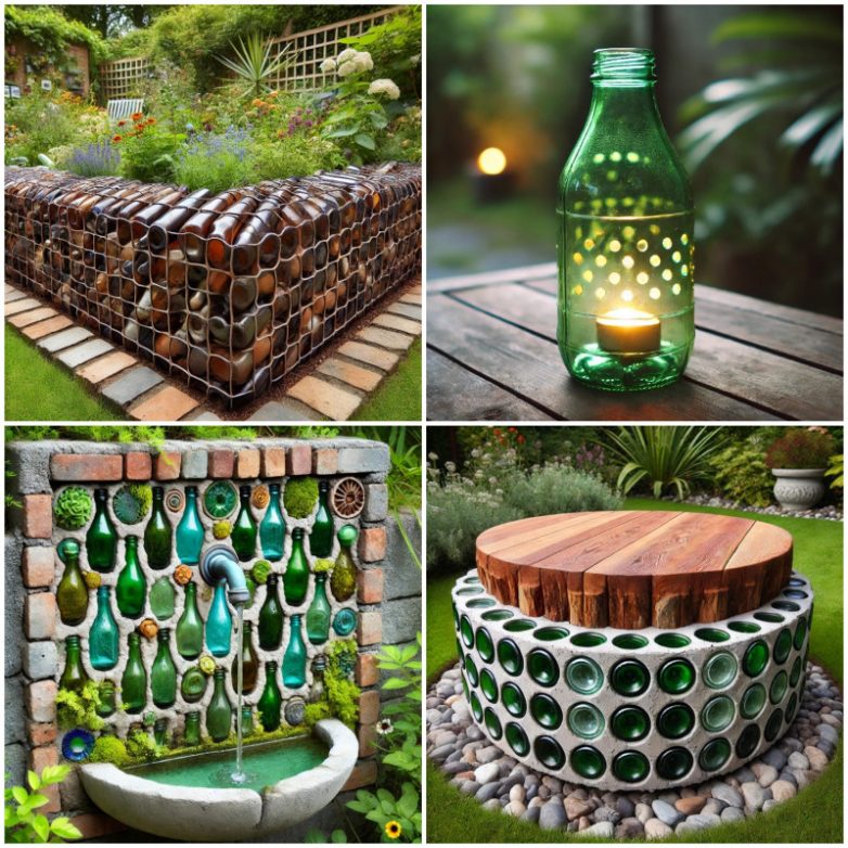 При создании садовых конструкций и мебели стоит обратить внимание на стеклянные бутылки. Заполнение ими стенок, залитых бетоном (всегда так, чтобы вода не попадала внутрь и не оставляла острых краев сверху), позволяет не только сэкономить на материале, но и создать конструкцию, которая будет гармонично сочетаться с растительностью.