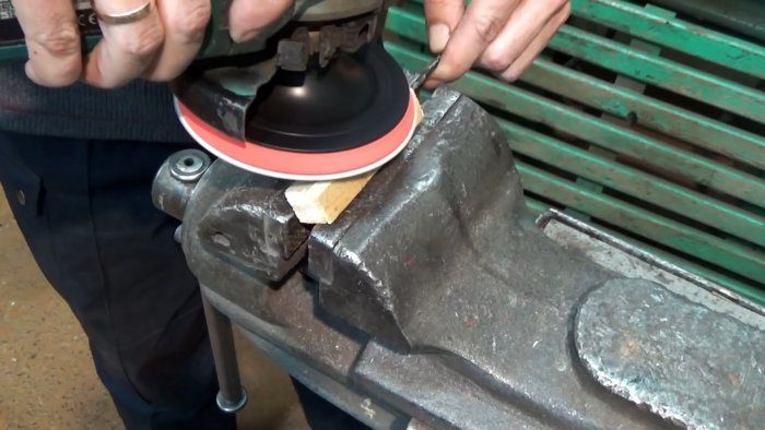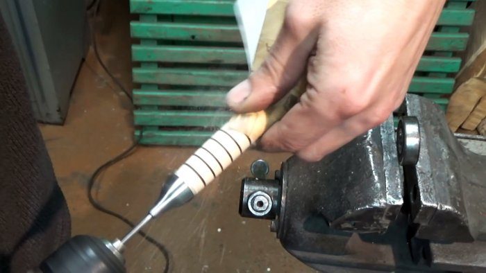 Ровный рез получится, если вращать его в патроне дрели. При желании также можно проточить рельеф на рукояти, чтобы она не скользила.