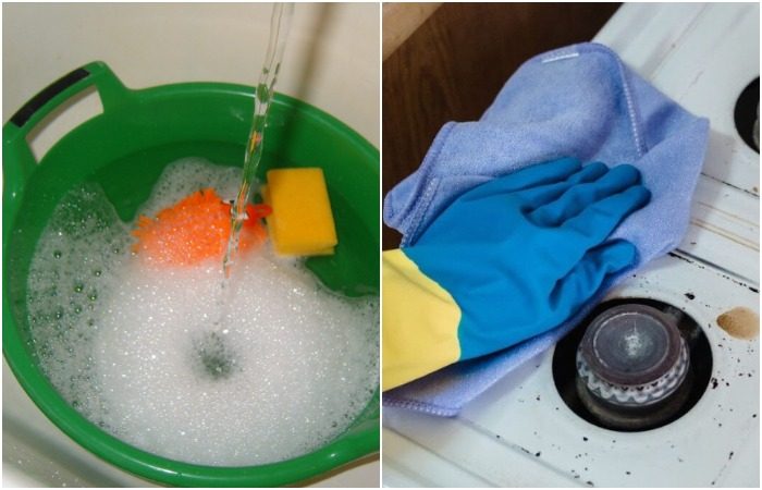 После того, как плита остынет, снимите конфорки и решетку, соберите крошки, кусочки еды и прочий мусор. Далее наберите в миску теплой воды, добавьте чайную ложку жидкости для посуды, хорошо вспеньте и смочите в полученном растворе тряпку из микрофибры. Тщательно протрите все загрязненные участки и подождите 15 минут, чтобы пятна размягчились. После этого уберите остатки влажной салфеткой. Если получилось убрать не все следы пригоревшей еды, воспользуйтесь помощью силиконового скребка. Еще раз хорошо протрите плиту чистой тряпкой и пройдитесь по ней бумажным полотенцем, чтобы не осталось лишней влаги.
