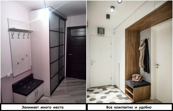 • Стремитесь к установке шкафов без боковин на виду. Это значит, что мебель полностью должна войти в нишу или занять свободное пространство от стены до стены. Если планировка комнаты не позволяет так сделать, просто достройте перегородку.