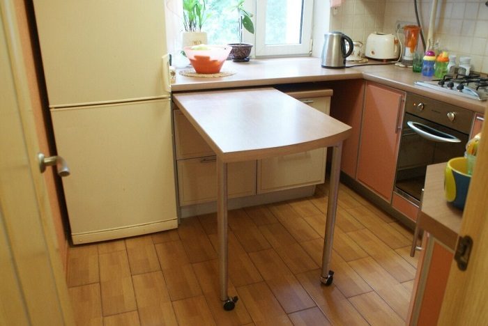 Нередко дизайнеры советуют переносить обеденную зону в гостиную, чтобы освободить место на кухне. Увы, такая рокировка возможна не во всех квартирах. Если это как раз ваш случай, обустройте складную или выдвижную столешницу, которая будет «выезжать» из рабочей зоны. Это очень удобное и компактное решение, которое поможет решить проблему отсутствия обеденной зоны.