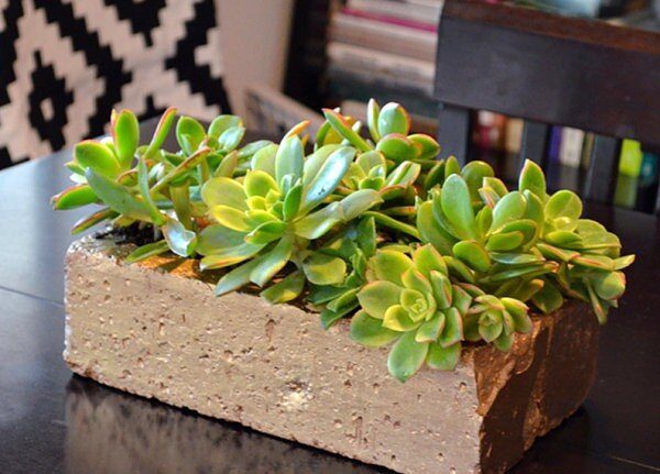 Интересный вариант применения кирпича, особенно, если его не так много, это создание горшков и кашпо. Уже даже звучит оригинально, а смотреться будет ещё лучше, так что самый обычный облицовочный кирпич можно использовать не только в строительных целях, но даже как стильный отдельный элемент декора. В отверстия кирпича нужно будет всего лишь поместить небольшое количество земли и посадить растения, которые не будут требовать много влаги и при этом будут маленькие, потому что пространство внутри всё-таки ограничено. Очень красиво в нём будут смотреться суккуленты, карликовая сансевиерия, а также фиалки и геббиум. Оригинальный вариант, может быть как напольным кашпо в беседке или зоне отдыха, так и отлично будет смотреться в помещении, а столе или подоконнике.