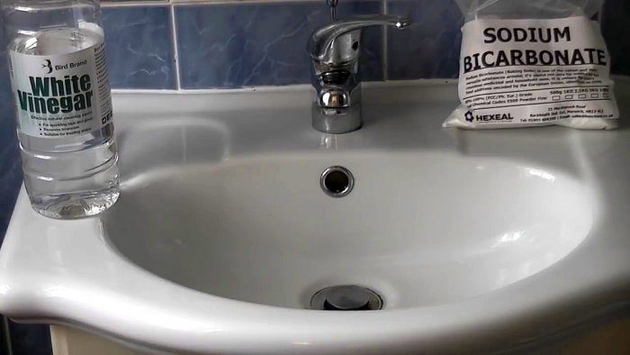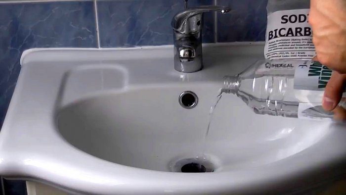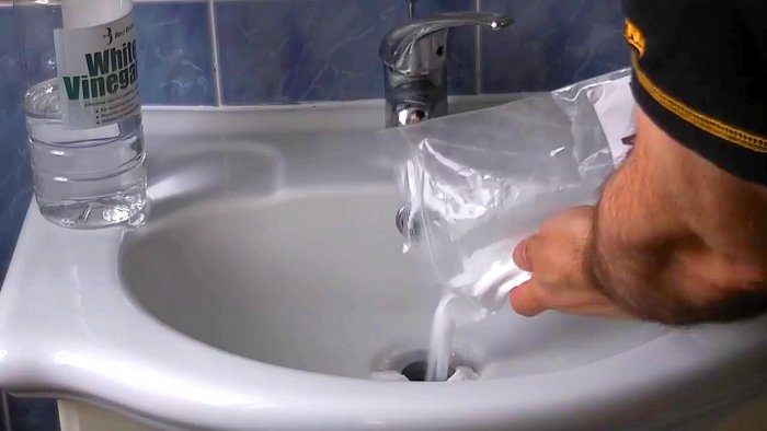 Процесс очистки засора в сливе при помощи соды и уксуса