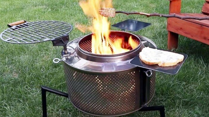 В целом сложно сделать что-то из старой стиральной машины целиком, но вот её барабан имеет особую ценность! Он отлично подходит для сооружения мангала или барбекю. Смотреться такой барабан будет очень стильно, а особых затрат, сил и времени для его извлечения и установки не понадобится. Если барабан выполнен из хороших материалов, что способен выдерживать высокие температуры, то сможет прослужить долго и в столь агрессивной среде. К тому же у него уже сразу есть перфорация для циркуляции воздуха, в таком барабане будет проще развести огонь, чтобы пожарить мясо. Если же приложить к его преобразованию немного усилий, то он превратится в отличную дачную коптильню или небольшую мобильную печку. Для этого потребуется установить его на треногу, а сбоку прорезать отверстие. Туда будут закладываться дрова, сверху же ставится казан или обычная кастрюля подходящего размера. Отличный вариант для тех, кто не хочет просто так выбрасывать старую стиральную машинку и не знает при этом, что из неё можно сделать.