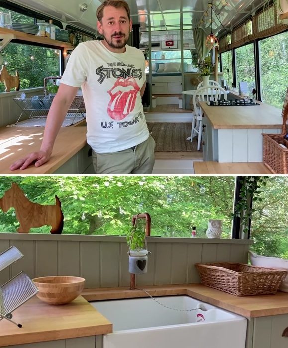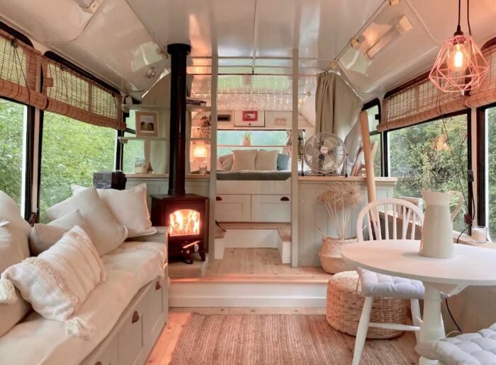 Учась на мастер-классах на каналах YouTube, дуэт шаг за шагом превращал заброшенный автобус в уютное жилище, рассчитанное на двоих. Так появились теплые полы и встроенная мебель в каждой жилой зоне, которая расширяет функции каждой из них, ведь ограниченные размеры требуют бережного отношения к каждому квадратному сантиметру площади. При этом не забыли поменять уплотнительные резинки на больших окнах, которые решили сохранить все до единого, ведь старая добрая Англия не балует обилием солнечных дней. Созданию светлого пространства поспособствовал и выбор цветовой палитры при оформлении интерьера миниатюрного убежища, в котором пара планировала жить и работать на постоянной основе. А для холодных зимних месяцев они установили настоящую дровяную печь, поддерживающих «живое» тепло.