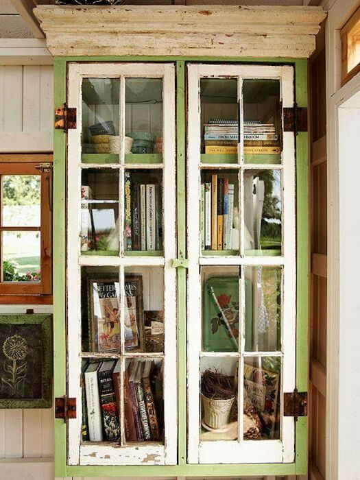 Для тех, у кого имеются большие коллекции разнообразных вещей, да даже книг или посуды, рамы могут стать витриной. Специальным большим шкафом, от пола до потолка состоящим из стёкол и полок, где ничто не будет заслонять любимые вещи. А тратиться на новую мебель не придётся совсем, и особенно здорово, если эти рамы будут к тому же старинными. Нет никакой нужды подбирать одинаковые, одноразмерные и даже подходящие по цвету друг к другу рамы. Красота такой витрины заключается как раз в том, что она крайне необычная и сделанная из того, что есть, это и будет их яркой отличительной чертой. Хотя, безусловно, лучше не совмещать двойные пластиковые и деревянные. Конечно, рамы не должны быть гнилыми и грязными, их стоит обязательно обработать прежде чем мастерить такую витрину.