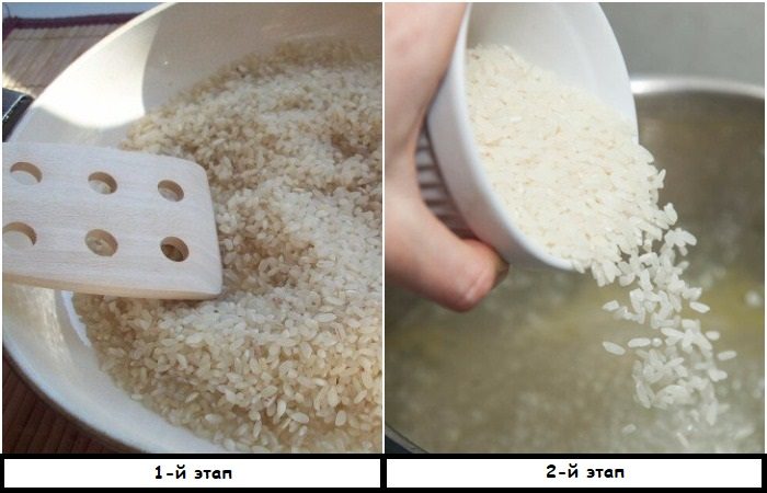 Сначала обжарьте рис, а затем переложите в кастрюлю с водой