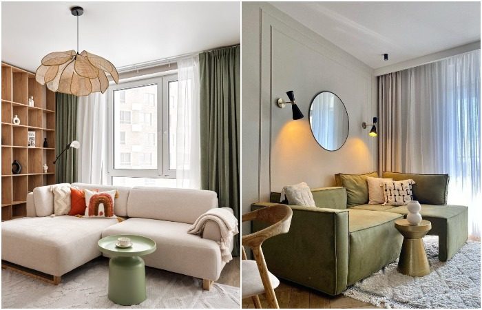 Что касается цветовой гаммы, то здесь преобладают светлые и нейтральные оттенки, например, светло-серый, кремовый, бежевый. Но без акцентов тоже не обходится. Чтобы создать идеальную комбинацию, отдавайте предпочтение зеленому, синему, коричневому, всем оттенкам серого – эти цвета не только являются универсальными и отлично вписываются в любой интерьер, но также легко сочетаются друг с другом.