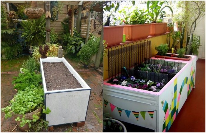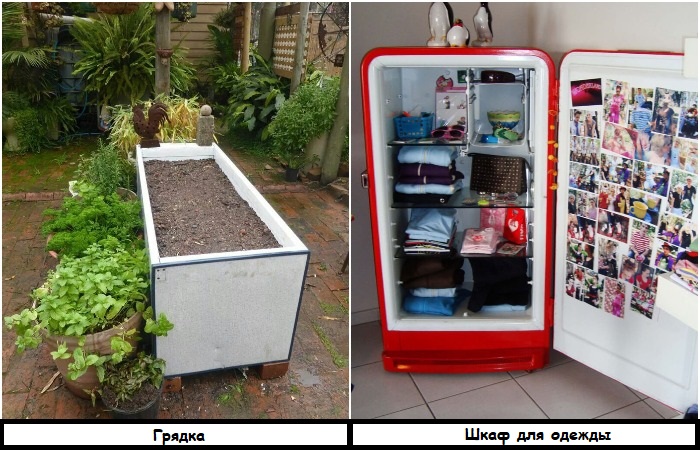 Предыдущие варианты полезны и практичны, но с ними придется повозиться. Если же у вас нет времени «изобретать велосипед» и хочется максимально простых решений, сделайте из нерабочего холодильника необычную клумбу для цветов. Так вы точно добавите своему цветнику изюминку, сделаете его красивым и оригинальным. Еще один плюс такого изобретения заключается в том, что до цветов не доберутся вредители, например, кроты или грызуны, которые часто повреждают луковичные культуры. Кстати, в клумбу необязательно сажать исключительно декоративные растения – там отлично будут смотреться и съедобные, поэтому выбирайте то, что вам нужнее.