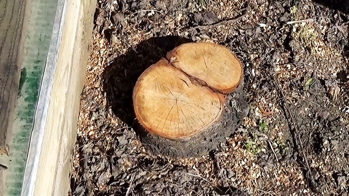 Примерно через год пенек можно выворачивать. От него отвалится кора, древесина станет мягкой и податливой, внутри образуется древесная труха.