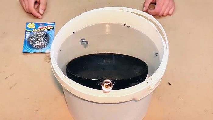 После того, как нагар выгорит и отслоится почти полностью, не дав остыть раскаленной сковородке, быстро погружаем ее в емкость с холодной водой. Резкий перепад температуры также способствует очистке посуды от нагара.