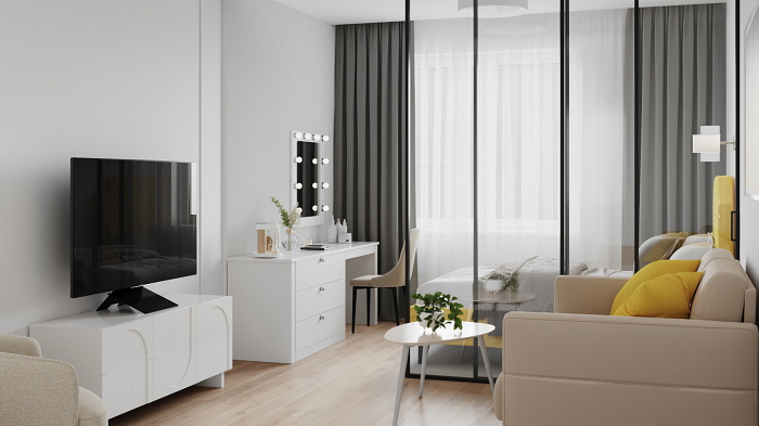 В маленькой квартире важным моментом является зонирование, так как в одной комнате часто располагаются сразу несколько участков с разными функциями: зона отдыха, спальное место, кабинет и пр. Для этих целей можно использовать шторы, деревянные рейки, стеллажи, но дизайнеры рекомендуют отдать предпочтение стеклянным перегородкам.