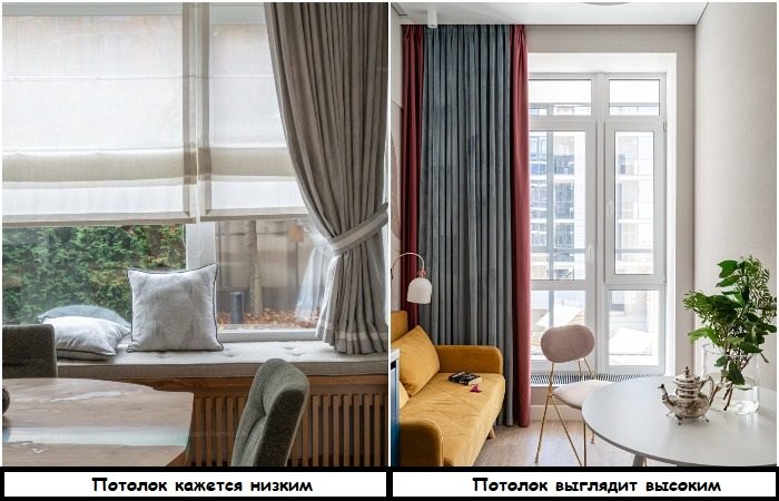 От штор также зависит восприятие комнаты. Если повесить текстиль, который будет едва прикрывать подоконник, потолки будут автоматически казаться ниже. Тот же эффект мы получим, если разместить карниз прямо над окном. Как правильно? Вешайте занавески на максимальную высоту над окном, как можно ближе к потолку. Важно, чтобы они доставали до пола и занимали всю ширину стены. Таким образом, получится избежать контрастов и разрывов – пространство вокруг окна будет казаться единым, ничего не станет дробить его на части.