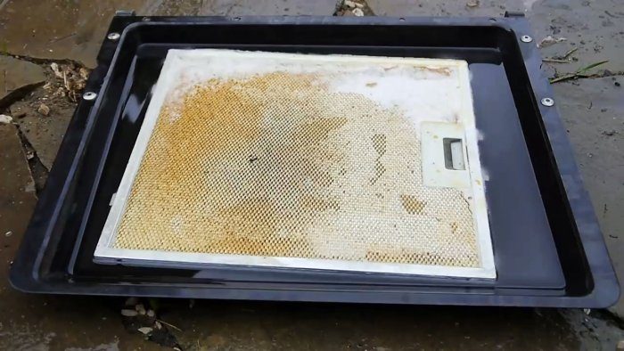 Для очистки нужно снять решетку из вытяжки. В зависимости от конфигурации последней, решетка может быть одинарной или двойной. Далее ее нужно уложить в любую металлическую емкость с широким дном. Для двойной решетки достаточно противня от духовки.Емкость с решеткой выносится на улицу или балкон. В помещении чистку лучше не делать, поскольку процесс сопровождается испарением из раствора воды и характерного запаха. Сверху решетки выливается «Крот», лучше чтобы она погрузилась в жидкость полностью.