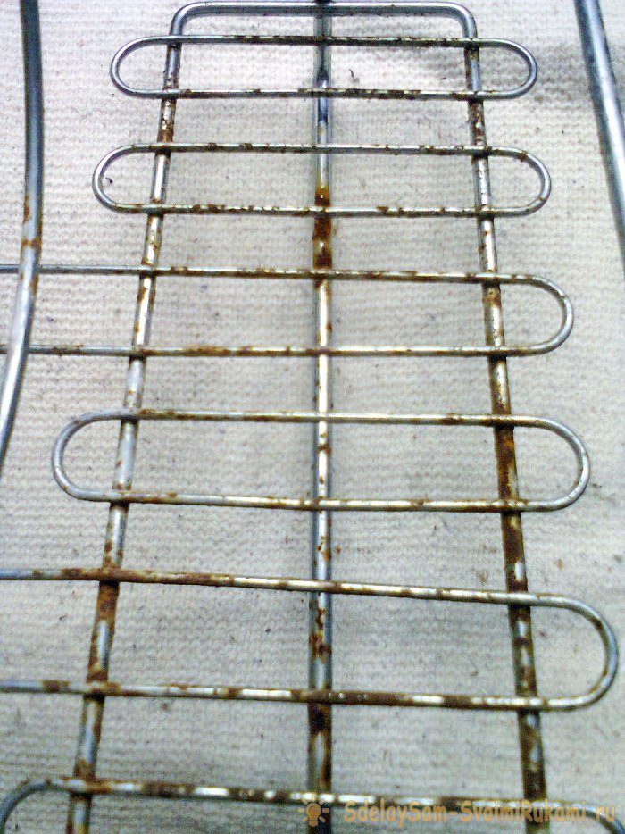 Я давно смотрела на свою сушилку для посуды. Она металлическая, куплена в магазине эконом-класса. Качество соответствующее. Так как сушилка постоянно контактирует с влагой, то через некоторое время наш предмет интерьера покрылся неприятным рыжим налётом. Пробовала отмывать водой и мочалкой, а что толку: налёт только увеличивался и появилась рыхлая ржавчина. На снимке только фрагмент решётки, для того чтобы можно было ближе рассмотреть, как это выглядело.