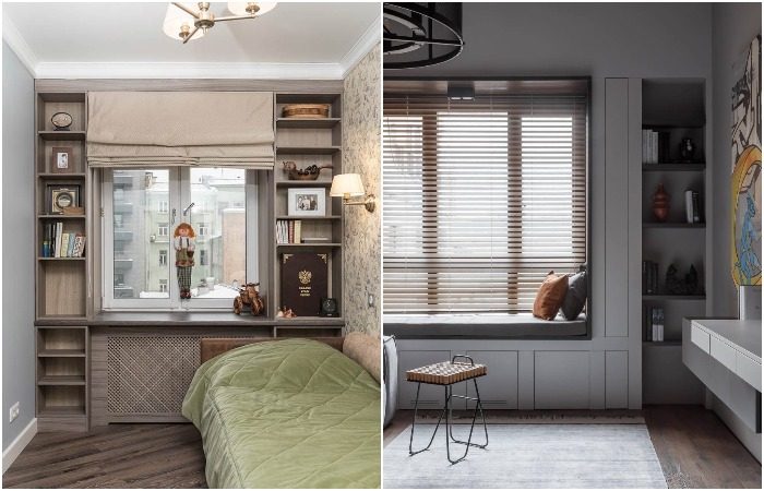 Если зона около окна пустует, самое время занять ее. Идеальный вариант – стеллаж, ведь он поможет задействовать каждый свободный метр пространства. Чтобы мебель не перегружала комнату, сделайте ее не слишком глубокой. Хорошо, если между окном и стеной останется немного места – тогда стеллаж отлично туда впишется и не будет слишком выступать. Наоборот, он практически полностью сольется со стеной. На полках можно хранить книги, канцелярию, документы и другие нужные вещи. Чтобы все выглядело эстетично, можете дополнить их стильными вазами, статуэтками или комнатными растениями. Но не увлекайтесь – все-таки зона для хранения должны быть в первую очередь практичной, ведь речь идет об организации однокомнатной квартиры.