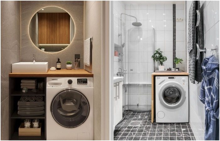 Обратите внимание: Если вы планируете разместить стиральную машину под раковиной, тогда ни первый, ни второй вариант хранения вам не подойдут. В этом случае можно повесить полки над унитазом, поставить в пространстве между стеной и раковиной узкую этажерку на колесиках, установить подвесной шкаф.