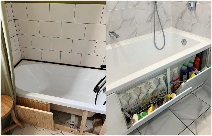 В продолжение темы о хранении в ванной комнате нельзя не упомянуть о еще одной зоне, которую обязательно нужно задействовать. Найти место для запасов туалетной бумаги, стирального порошка, бытовой химии и прочих хозяйственных мелочей легко, если…заглянуть под ванну. Обычно это пространство пустует, и очень зря. Оно идеально подходит для хранения самых разнообразных предметов, нужно лишь купить или сделать своими руками экран, чтобы не создавать визуальный шум. Важно, чтобы он открывался и закрывался, а не был литым – тогда вы в любой момент сможете взять из-под ванны все, что нужно. Выбирайте нейтральную и эстетичную модель, которая хорошо впишется в интерьер комнаты.