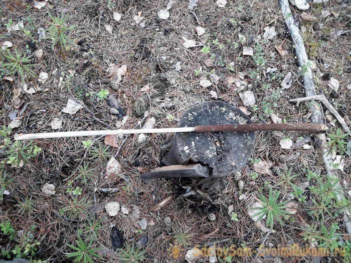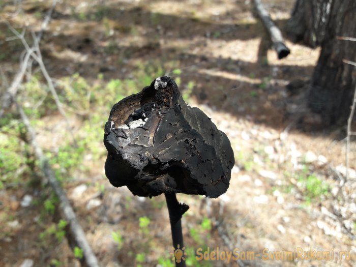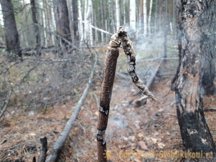 Теперь поджигаем край гриба, и втыкаем ветку в землю, метрах в пяти от стоянки.