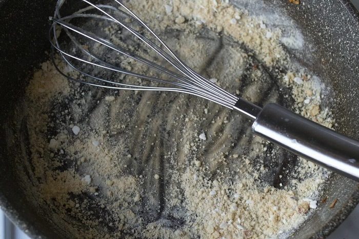 Сначала муку нужно обжарить на сковороде