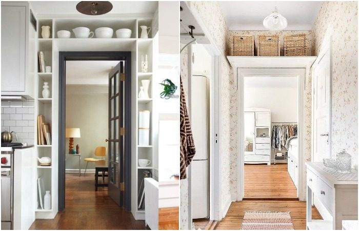 Над дверью можно установить не только полноценную антресоль, но и обычные полки. В большинстве случаев здесь размещают что-то легкое и декоративное, чтобы избежать падения вещей от случайного удара дверью. Это может быть коллекция сувениров, привезенных из отпуска, посуда (если полка находится над дверью в кухню), запасы полотенец или туалетной бумаги. Полки можно вешать как над межкомнатными дверьми, так и над входными. Впрочем, проем без двери также часто задействуют для этой системы хранения. Выбирайте тот вариант, который вам больше всего подходит.