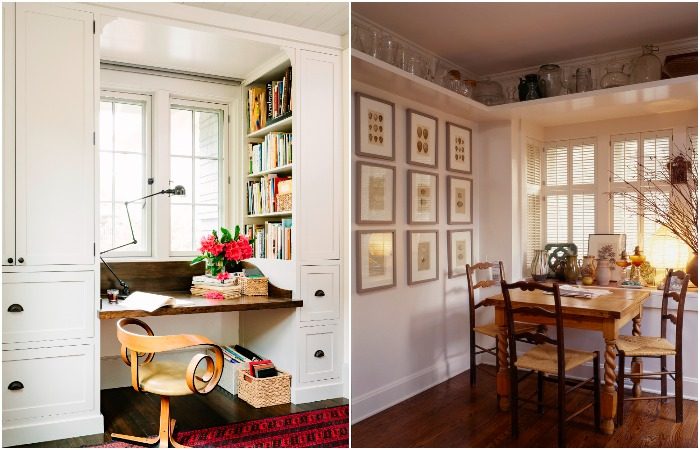 Зона над окном тоже не должна пустовать. Небольшое пространство, которое остается до потолка, может стать удобным пристанищем для книг и постеров в гостиной или посуды на кухне. Лучше всего использовать узкие полки, чтобы не перегрузить комнату и не лишить ее доступа естественного света. Не ограничивайтесь площадью над окном – выведите полку на соседнюю стену, чтобы увеличилось количества места для хранения.