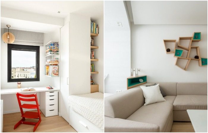 Окно часто незаслуженно игнорируют, когда речь идет о хранении, а ведь это идеальная зона для создания полноценного рабочего или учебного места. Подоконник можно расширить, превратив его в стол, а по бокам установить вместительные шкафы для книг, документов и других вещей. Также можно сделать торец одного из шкафов открытым, чтобы он стал своеобразным продолжением оконного откоса. Тогда вам не придется дополнительно сверлить стены для установки полок, и все предметы, которые нужны в первую очередь во время работы, будут под рукой. Еще один плюс такого вида хранения – отсутствие визуального шума. При входе в комнату содержимое полок будет едва заметно, так как вещи «смотрят» внутрь рабочего пространства.