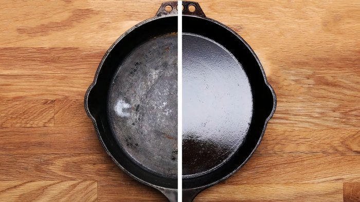 Традиционные чугунные сковороды имеют один недостаток — со временем начинает пригорать пища. Она приобретает темный некрасивый вид, усложняется процесс готовки. Если нагар не очень старый, то можно не только избавиться от неприятных явлений, но и предупредить их появление в дальнейшем.