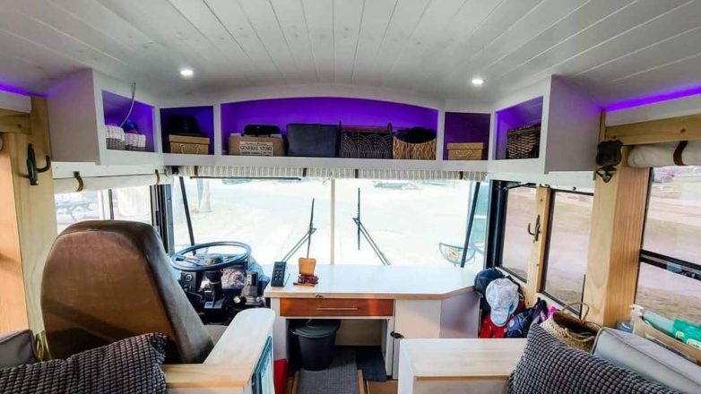 При оформлении внутреннего пространства энтузиастам пришлось поломать голову, что их автобус стал образцом многофункционального дизайна. Каждая зона в их мобильном доме, включая кабину водителя, выполняет широкий спектр функций, не жертвуя при этом стилем и эффективностью. Даже более чем компактная входная часть служит и подсобным помещением, и мини-гардеробной, и местом для домашних животных, и командным пунктом, и даже импровизированным рабочим местом. В кабине задействованы и вертикальные площади, чтобы обеспечить как можно большими пространствами для хранения вещей.