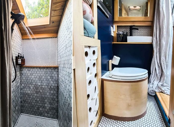 Расположенная между общим пространством и спальной зоной, ванная комната представляет собой образец компактного и функционального дизайна. Специально изготовленная дверь отделяет ее от остальных секторов, обеспечивая уединение без необходимости возведения громоздких перегородок. Внутри каждый сантиметр пространства тщательно оптимизирован для баланса практичности, комфорта и эстетики. Здесь нашлось место для полноразмерной душевой, облицованной миниатюрной керамической плиткой, узкой раковины с тумбой и компостного туалета. Чтобы максимально эффективно использовать ограниченное пространство, семья задействовала все доступные полости в стенах для разумного хранения, спрятав предметы первой необходимости в самые неожиданные уголки. Кстати сказать, главной изюминкой этой комнаты стал потолочный люк над душевой, что помогло визуально увеличить пространство и сделать процесс принятия водных процедур более приятным. Также он активно используется для проветривания.