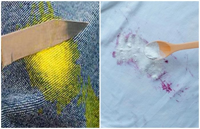 Помогает и домашняя смесь из соли и девятипроцентного уксуса и нашатырного спирта (также в равных частях). Получается паста, которая хорошо справляется с большинством сложных загрязнений, в том числе и с различной краской. Её наносят на пятно, оставляя на полчаса, а затем смывают водой и стирают.